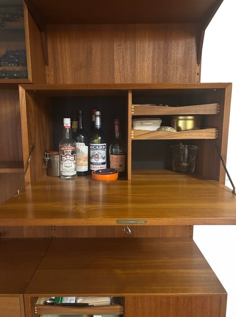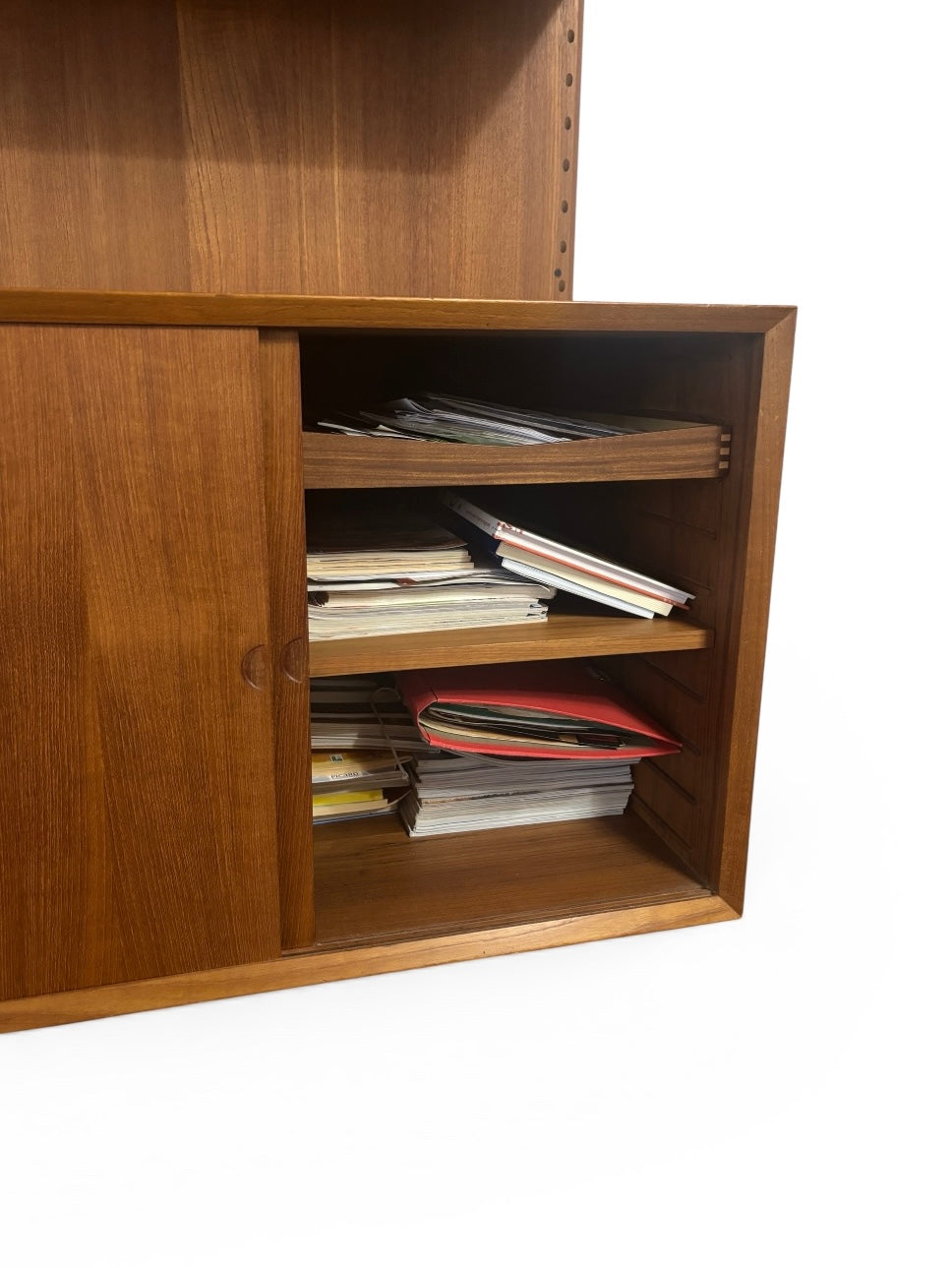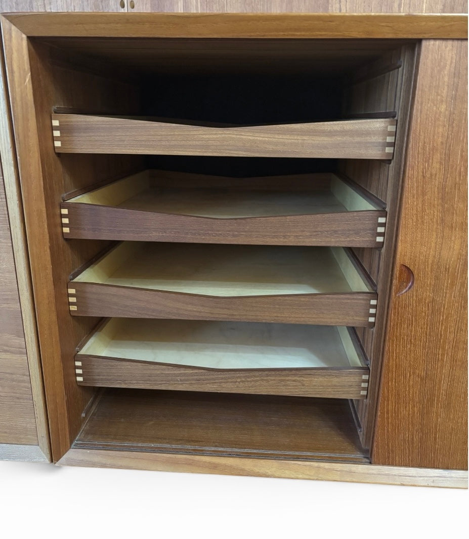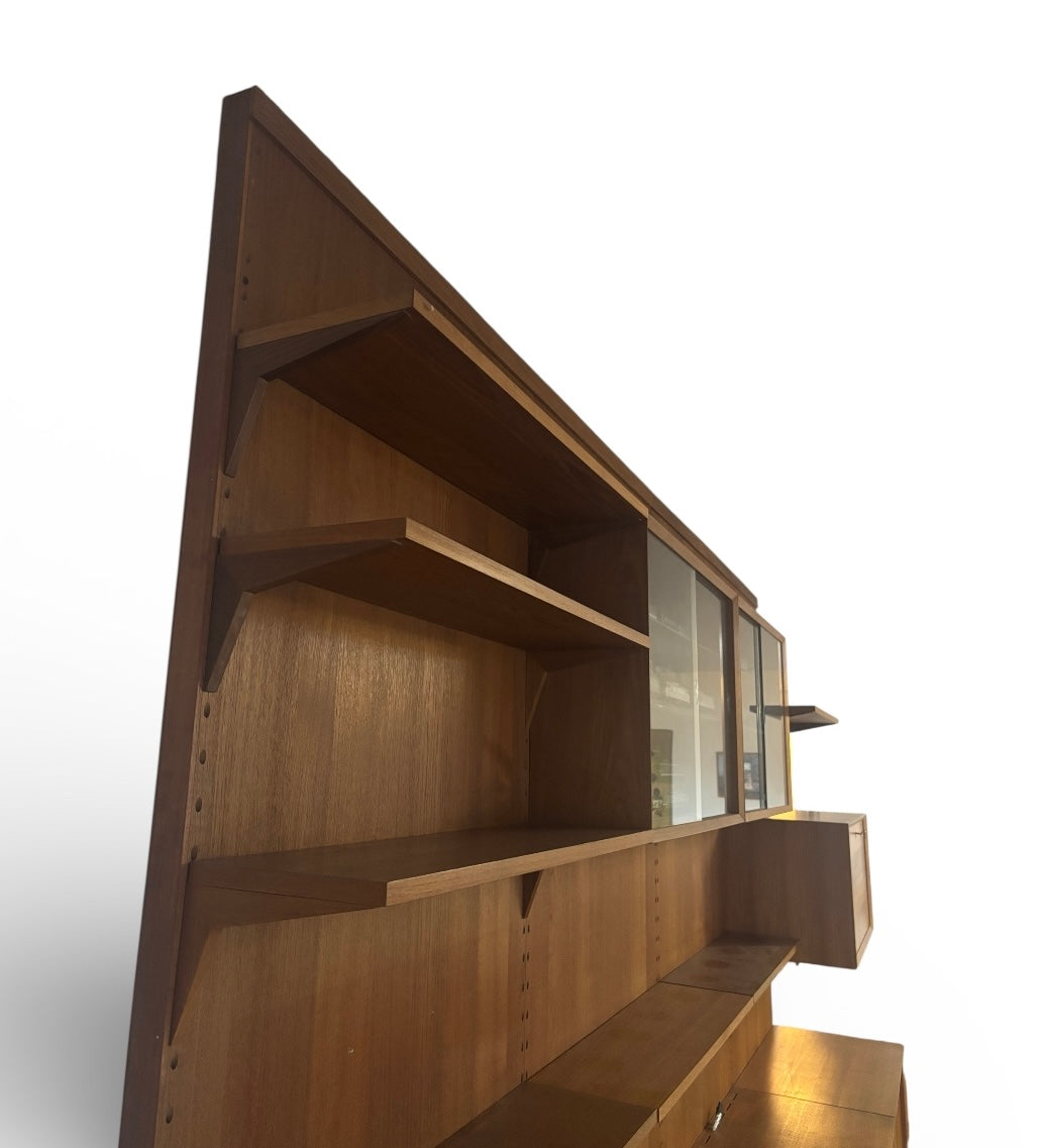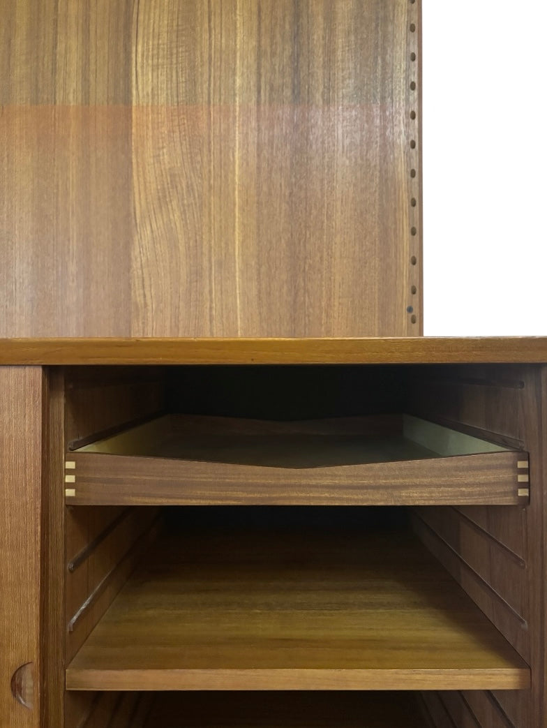 Système mural modulable emblématique du design danois, conçu en 1959 par Poul Cadovius et édité par Cado. Réalisé en teck, il se compose de 4 panneaux muraux accueillant, grâce à des équerres, 7 étagères et 5 caissons. L’ensemble comprend également 2 caissons à portes coulissantes vitrées, avec étagères en verre, offrant un équilibre parfait entre rangement fermé et présentation. La modularité permet une composition élégante et fonctionnelle, idéale pour un salon, un bureau ou une bibliothèque.